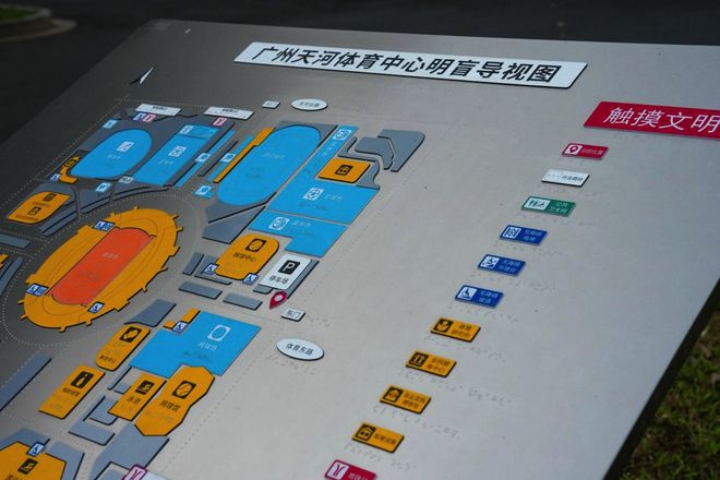 在天河体育中心,这里无障碍设施的细致程度令人叹为观止:场馆的无障碍导览台除了用盲文标注地标以方便盲人使用之外,还专门使用不同的鲜艳颜色区分不同功能区以方便弱视人群辨认,此外,导览台还设计得更矮,方便轮椅使用者触摸,更细致的是,考虑到广州的气候特征,导览台的盲文还选择了热惰性较高的材料,即使在炎热的夏天,盲文摸上去也不会烫手,方便视障人士感知。