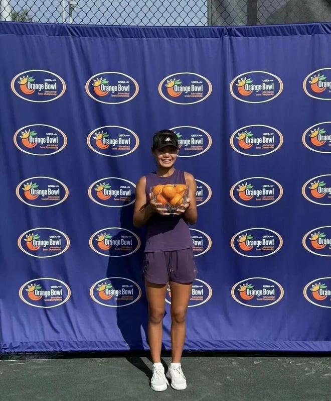 15岁的10后小将孙心然,在2025年橘子碗J500青少年网球锦标赛中,一路过关斩将,不失一盘拿下冠军——她手捧一个装满了橘子的碗,面向镜头,笑容灿烂。