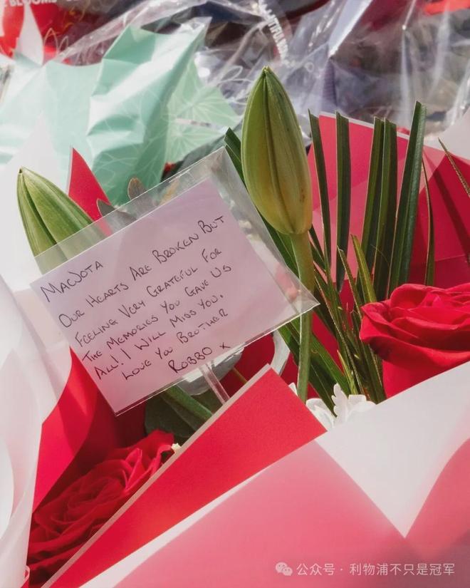 我在网络上搜索着罗伯逊和若塔的图片,除了那一张张拥抱和欢笑的照片,还有一张卡片,那是罗伯逊在七月份在安菲尔德球场外悼念若塔、敬献鲜花时,写给若塔的卡片: