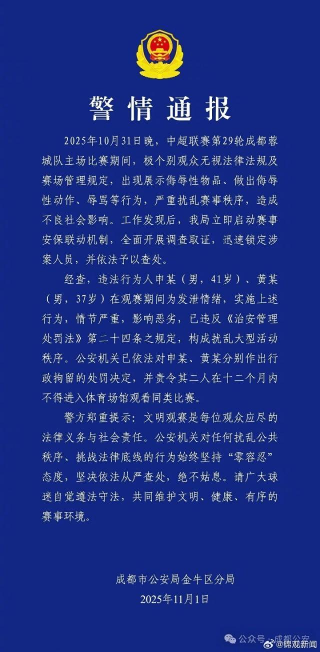 11月01日宣 成都市公安局金牛区分局通报,2名球迷观战蓉城vs河南时,出现展示侮辱性物品、做出侮辱性动作、辱骂等行为,已被行政拘留。