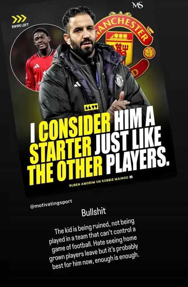 一周后,当梅努再次无缘主场亮相,曼联名宿斯科尔斯直接在Instagram上爆粗口回应:“狗屁!这孩子正被毁掉,一支连球都控不住的球队却不让他上。我讨厌看到自家青训离队,但现在对梅努来说,走也许是最好的选择,他受够了。”