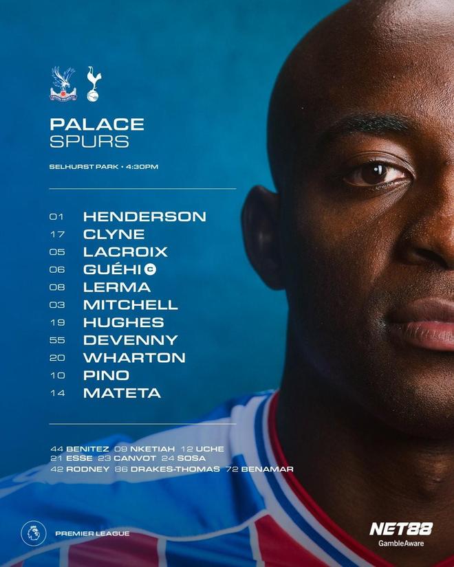 水晶宫首发:1-迪恩-亨德森、8-莱尔马、5-拉克鲁瓦、6-格伊、3-米切尔、20-亚当-沃顿、19-威尔-休斯、17-克莱因、10-耶雷米-皮诺、55-德文尼、14-马特塔