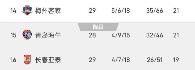 目前长春亚泰完赛29轮积19分垫底,梅州客家完赛29轮积21分排名倒三、因胜负关系暂离降级区,而青岛海牛完赛28轮积21分暂列倒二。